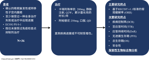 本研究共纳入36例受试者,既往均未接受过免疫检查点抑制剂治疗。接受卡瑞利珠单抗(200 mg,静脉注射,每2周1次,累计最长用药时长2年)和阿帕替尼(250 mg,口服,每天1次)联合治疗方案,每4周为1个治疗周期,直到疾病进展或毒性不可耐受。主要研究终点是基于RECIST v1.1标准评估的客观缓解率(ORR)。次要研究终点有疾病控制率(DCR)、至应答时间(TTR)、应答持续时间(DoR)、无进展生存期(PFS)、总生存期(OS)和安全性。同时对生物标志物进行探索性分析。