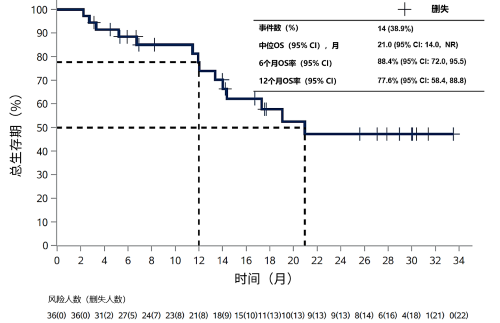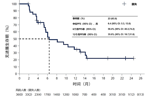 患者入组时间为2020年1月至2022年10月。截至2023年1月16日[1]。中位随访时间为14.0个月(IQR: 6.3, 23.3),36例疗效可评估人群中,确认的客观缓解率(ORR)为44.4%(95% CI: 27.9%, 61.9%),其中2例患者达到完全缓解(CR),14例患者达到部分缓解(PR),17例患者达到疾病稳定(SD),确认的疾病控制率(DCR)为91.7%(95% CI: 77.5%,98.2%)。